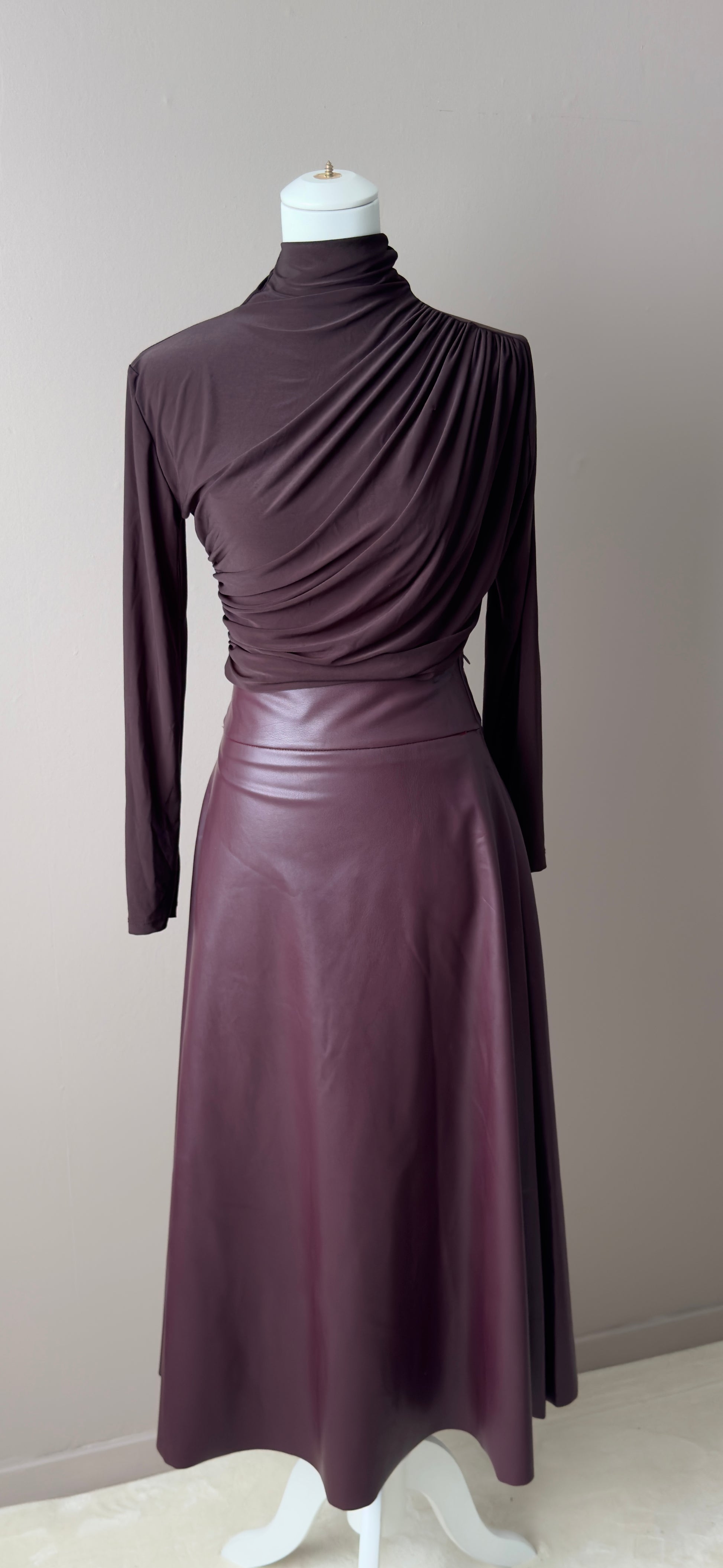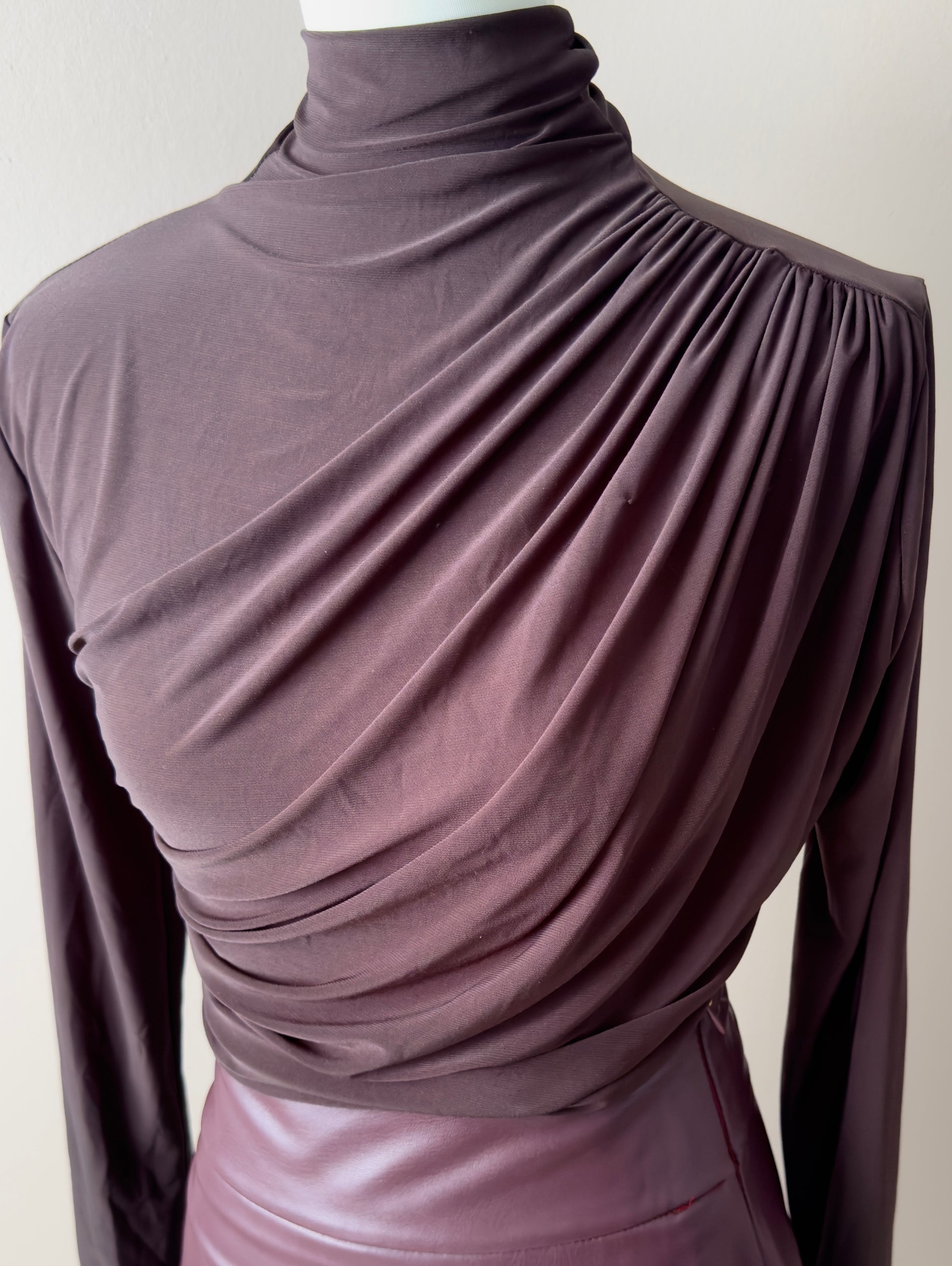 Cette blouse en jersey, drapée élégamment de l'épaule à la taille, allie confort et sophistication.