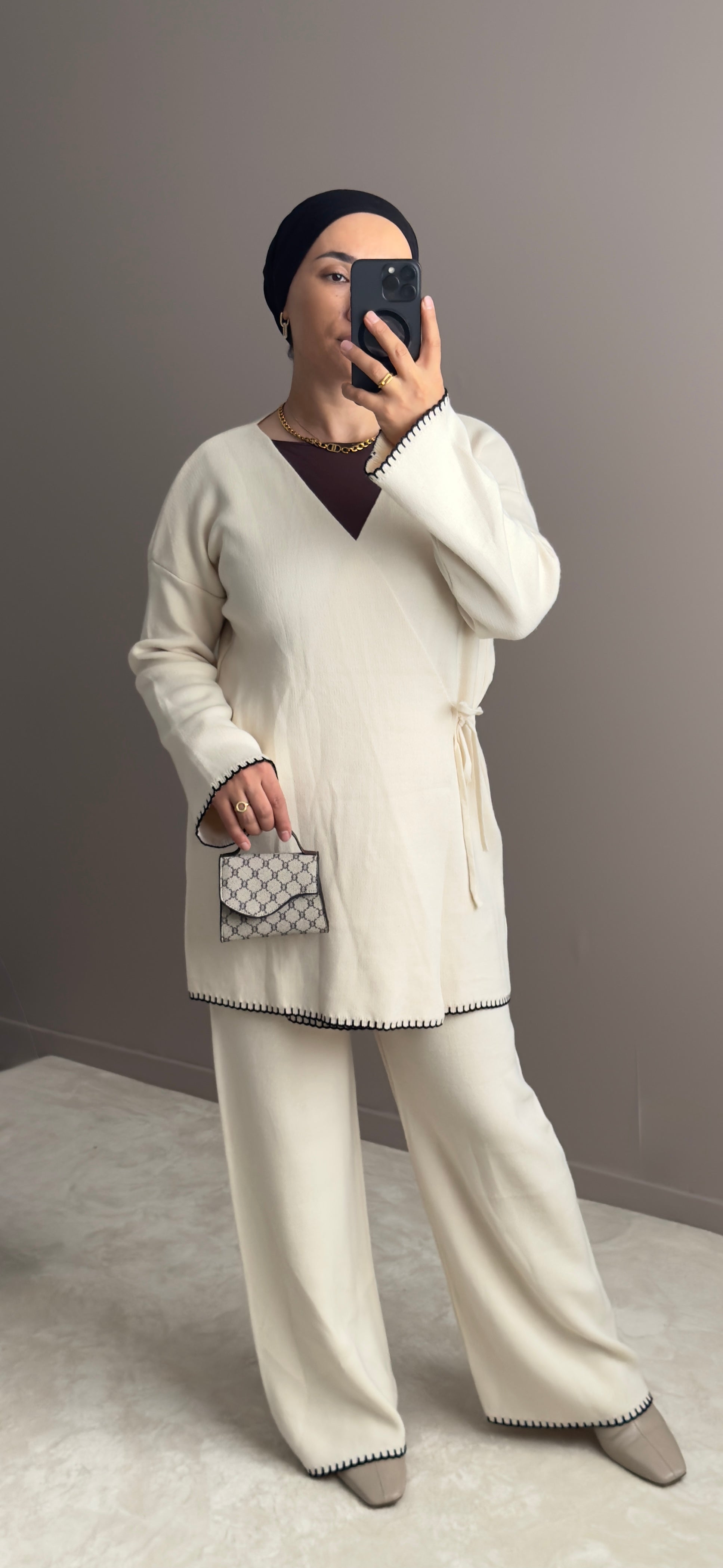 Découvrez une tenue beige élégante, minutieusement conçue pour offrir un équilibre parfait entre sophistication et modernité.