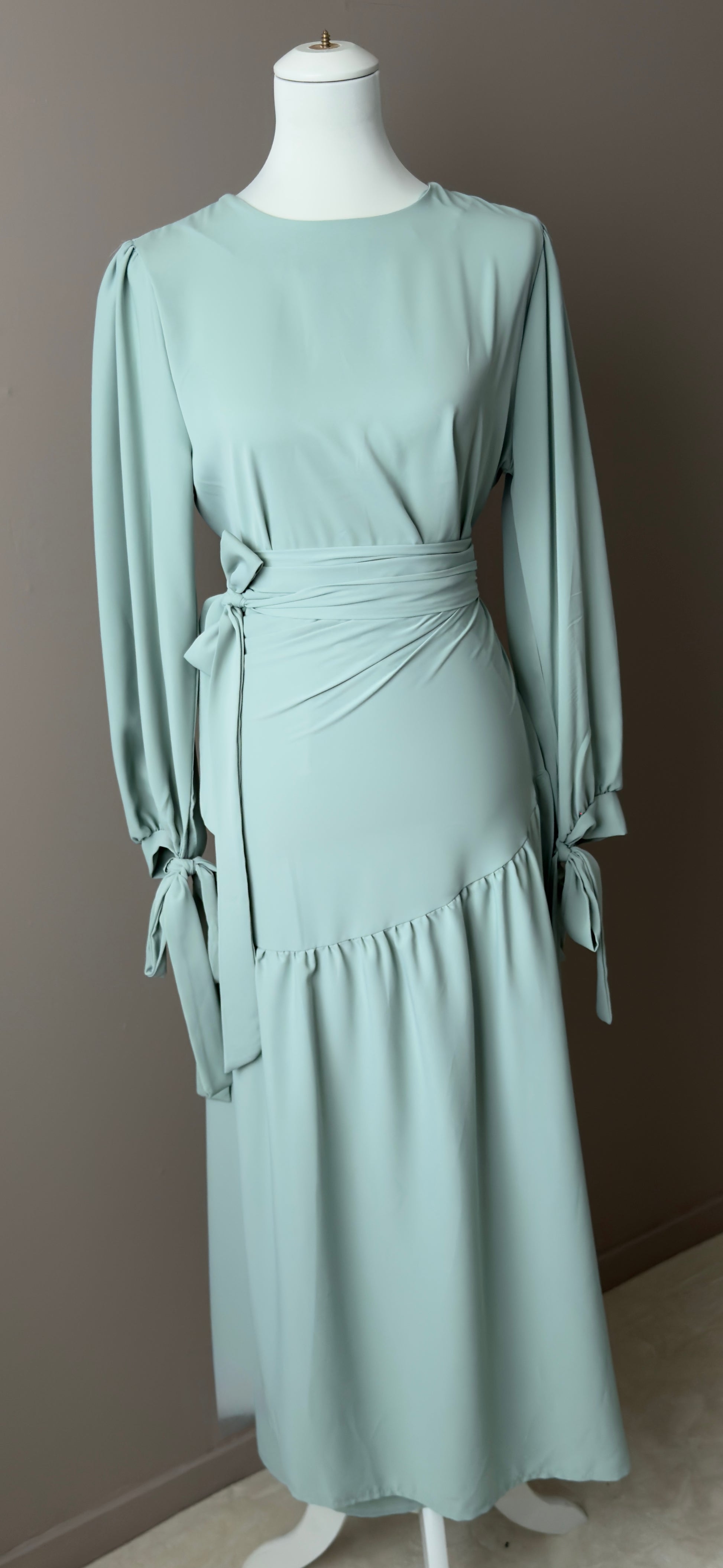 ENSEMBLE A JUPE DRAPEE ET MANCHES A LACETS