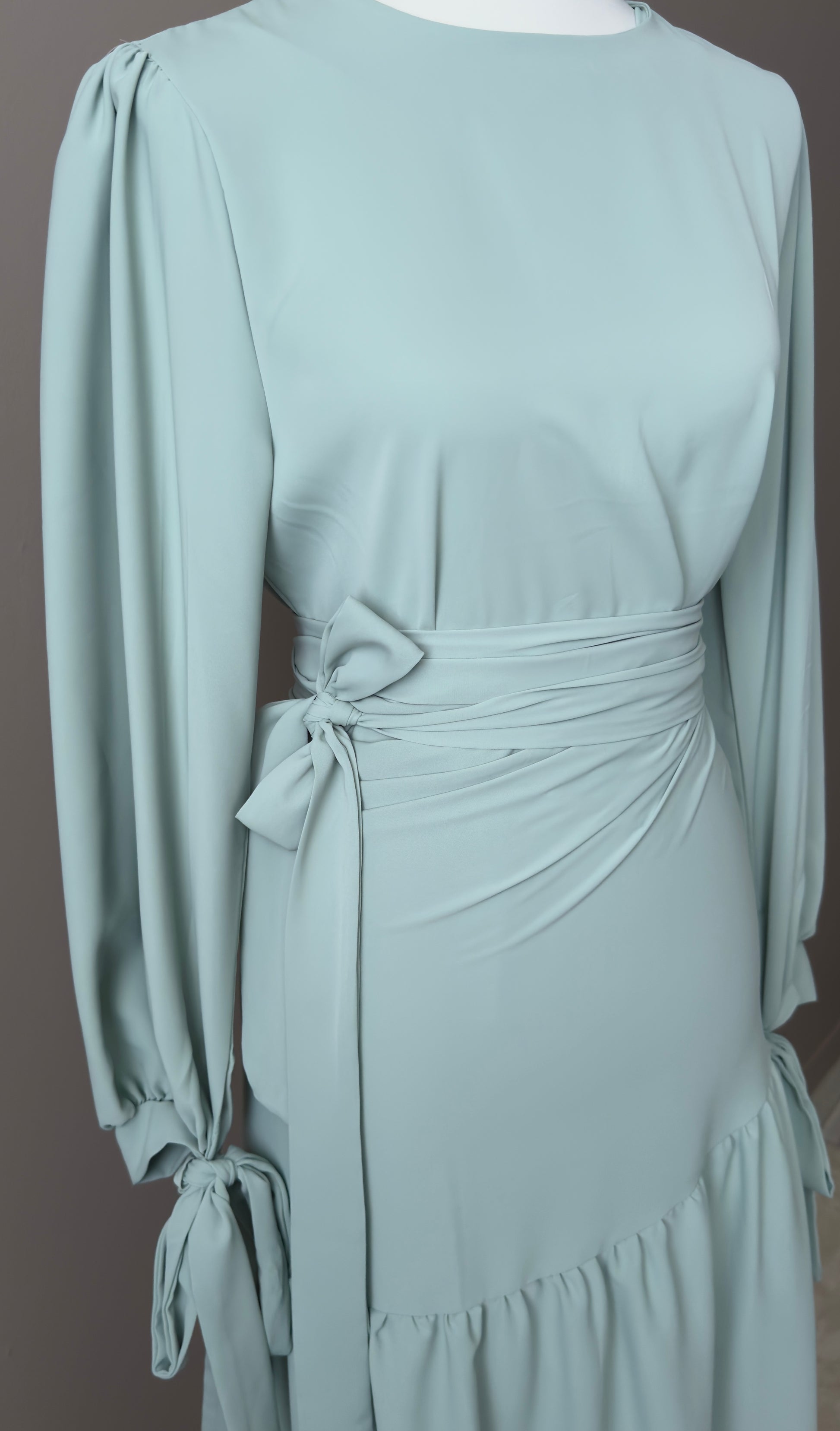 Découvrez notre ensemble sophistiqué composé d’une jupe drapée aux ourlets délicatement volantés et d’un haut à manches longues munies de lacets ajustables.