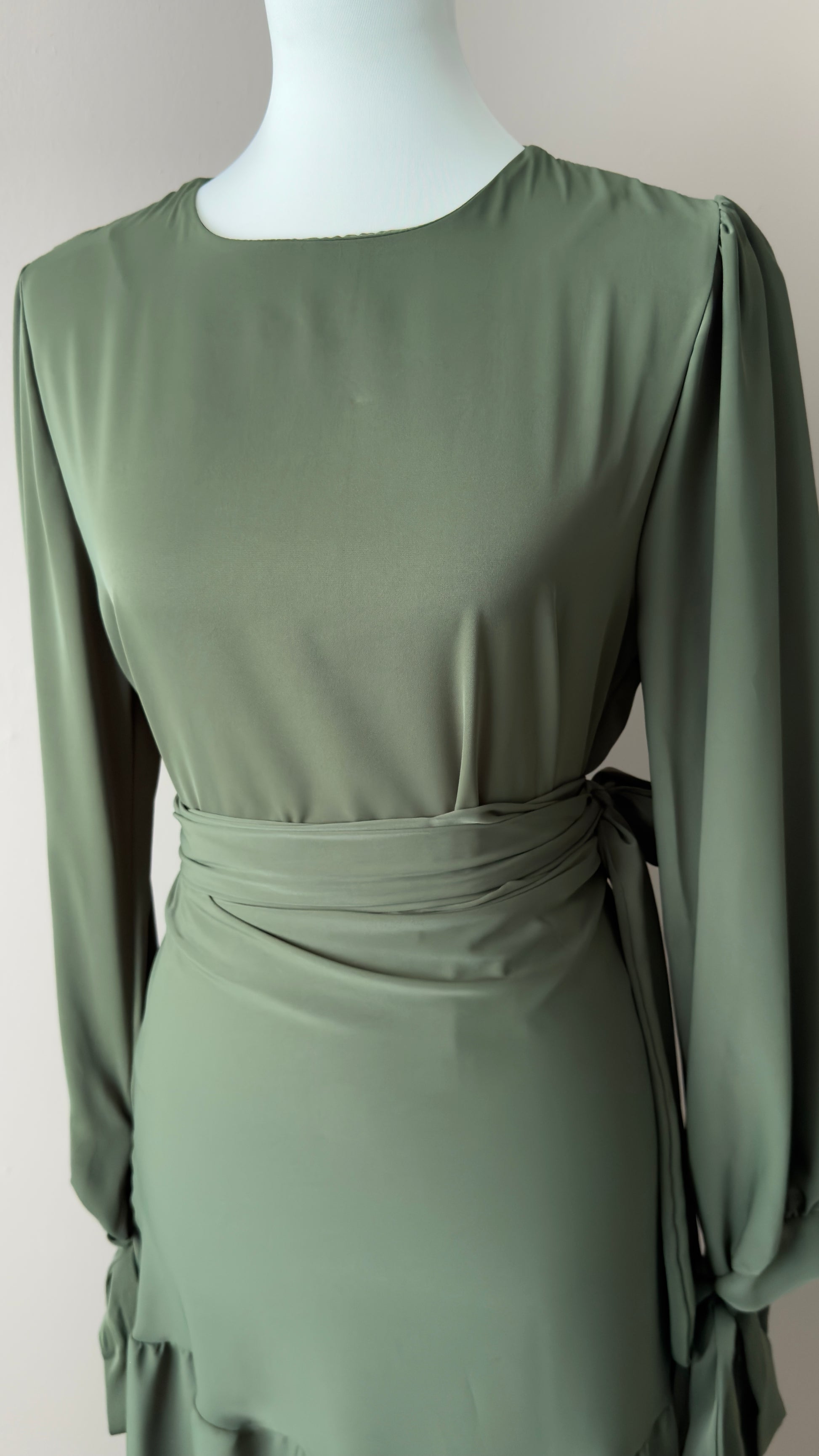 Découvrez notre ensemble sophistiqué composé d’une jupe drapée aux ourlets délicatement volantés et d’un haut à manches longues munies de lacets ajustables.