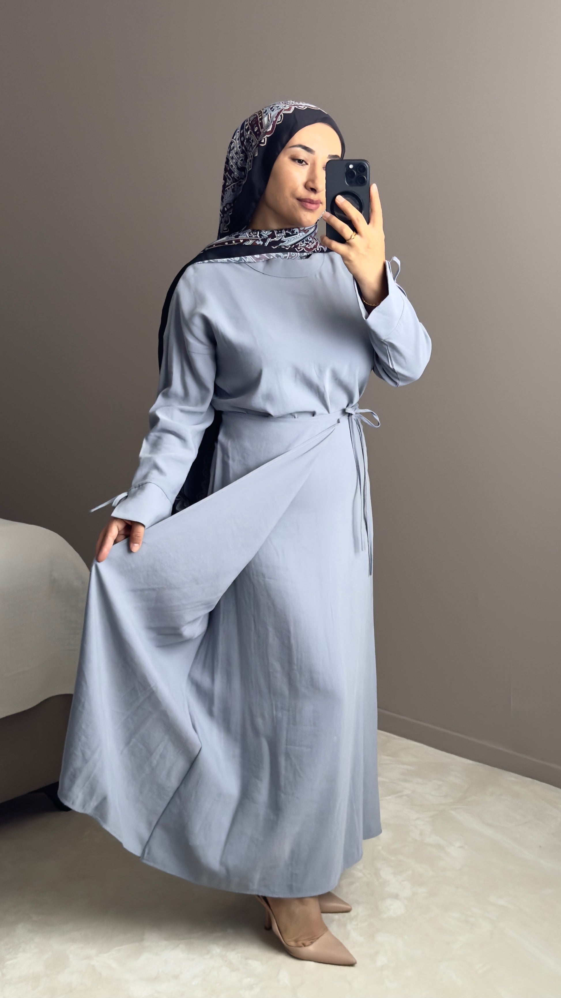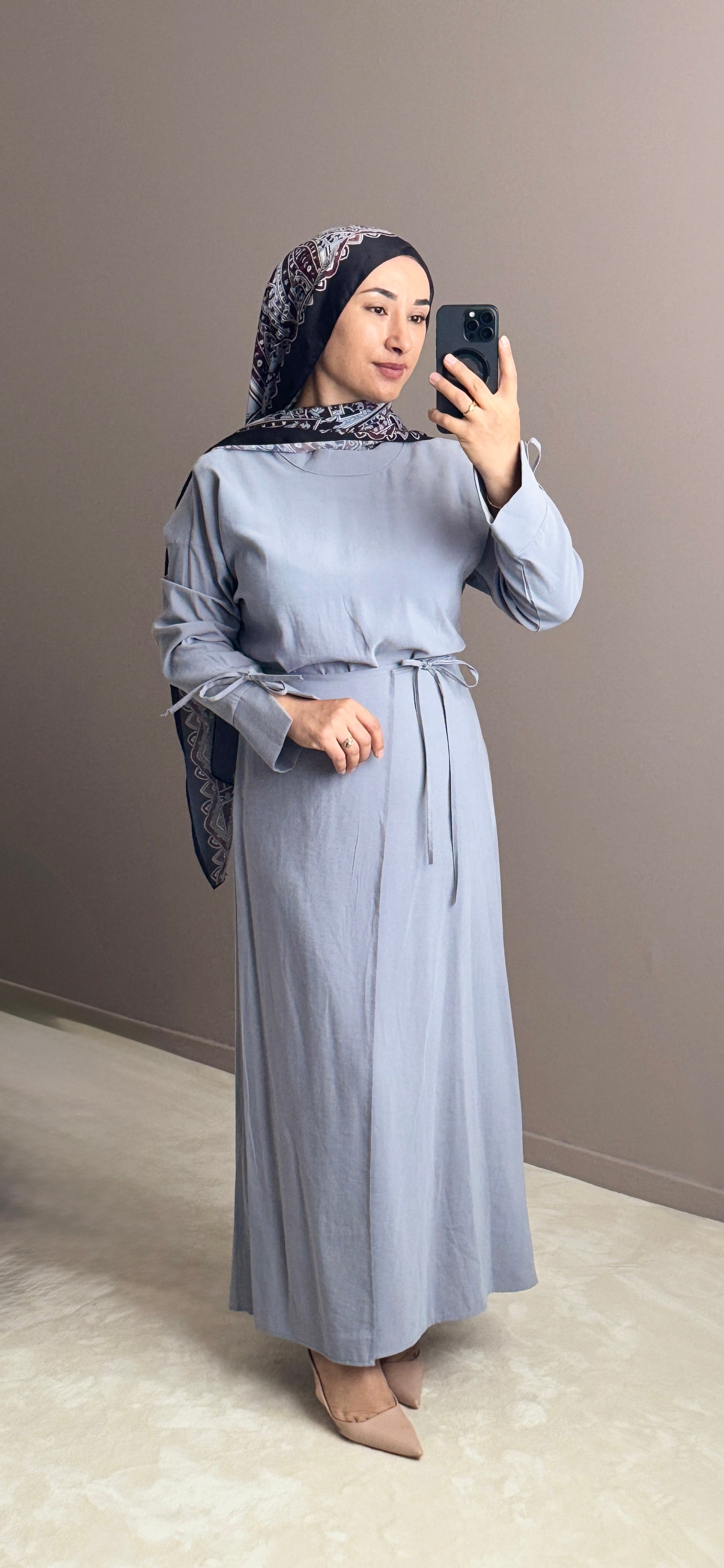 Cet ensemble argenté élégant met en avant une jupe portefeuille à taille haute confectionnée en tissu modal tencel, reconnu pour son confort et sa fluidité.