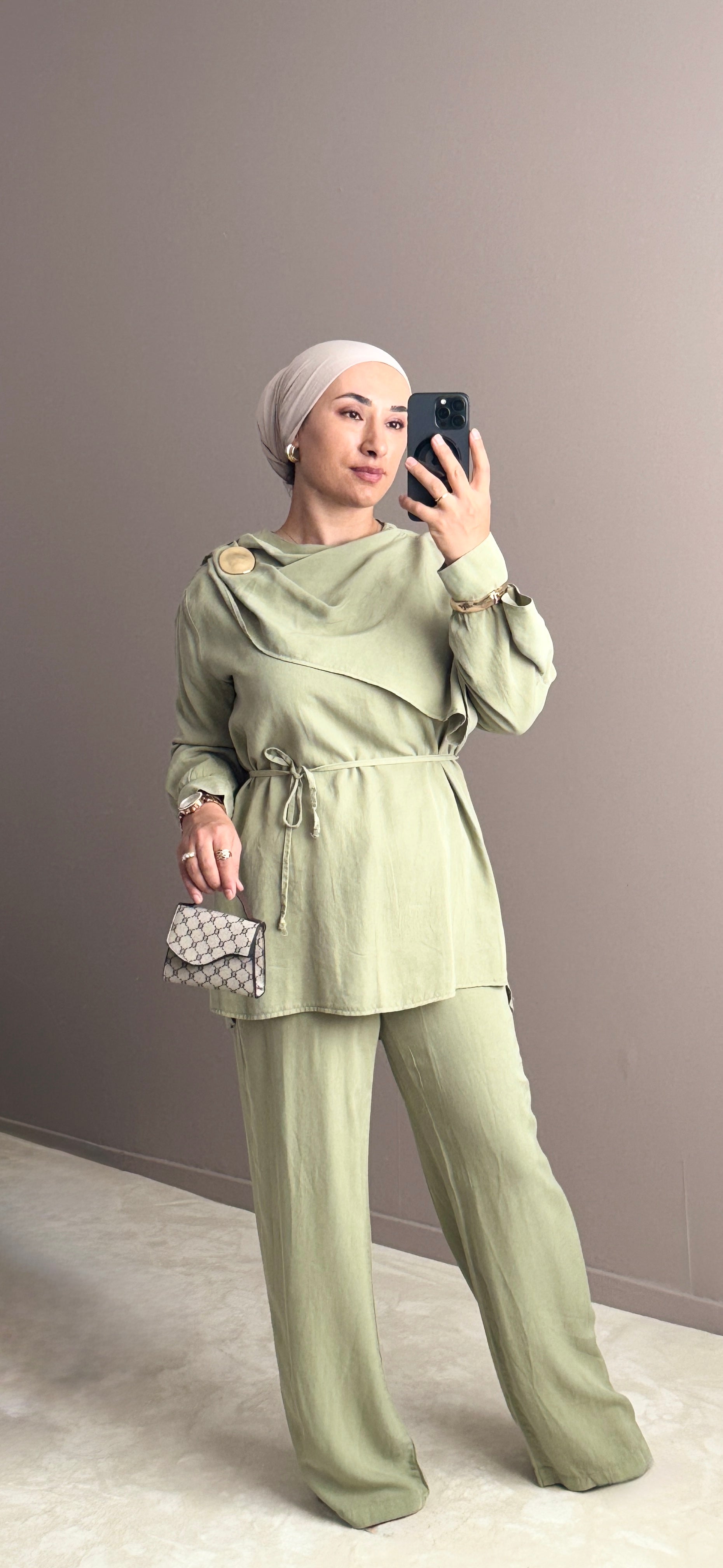 Cet ensemble avec cape à l’épaule combine élégance et confort grâce à son tissu modal doux et agréable. Le pantalon offre deux poches latérales et une taille élastique réglable par cordons, garantissant un ajustement parfait. Une ceinture amovible permet de personnaliser la silhouette selon vos envies. Une broche offerte vient sublimer l’ensemble. Disponible en deux tailles : la taille 1 convient jusqu’au 42, et la taille 2 jusqu’au 46.