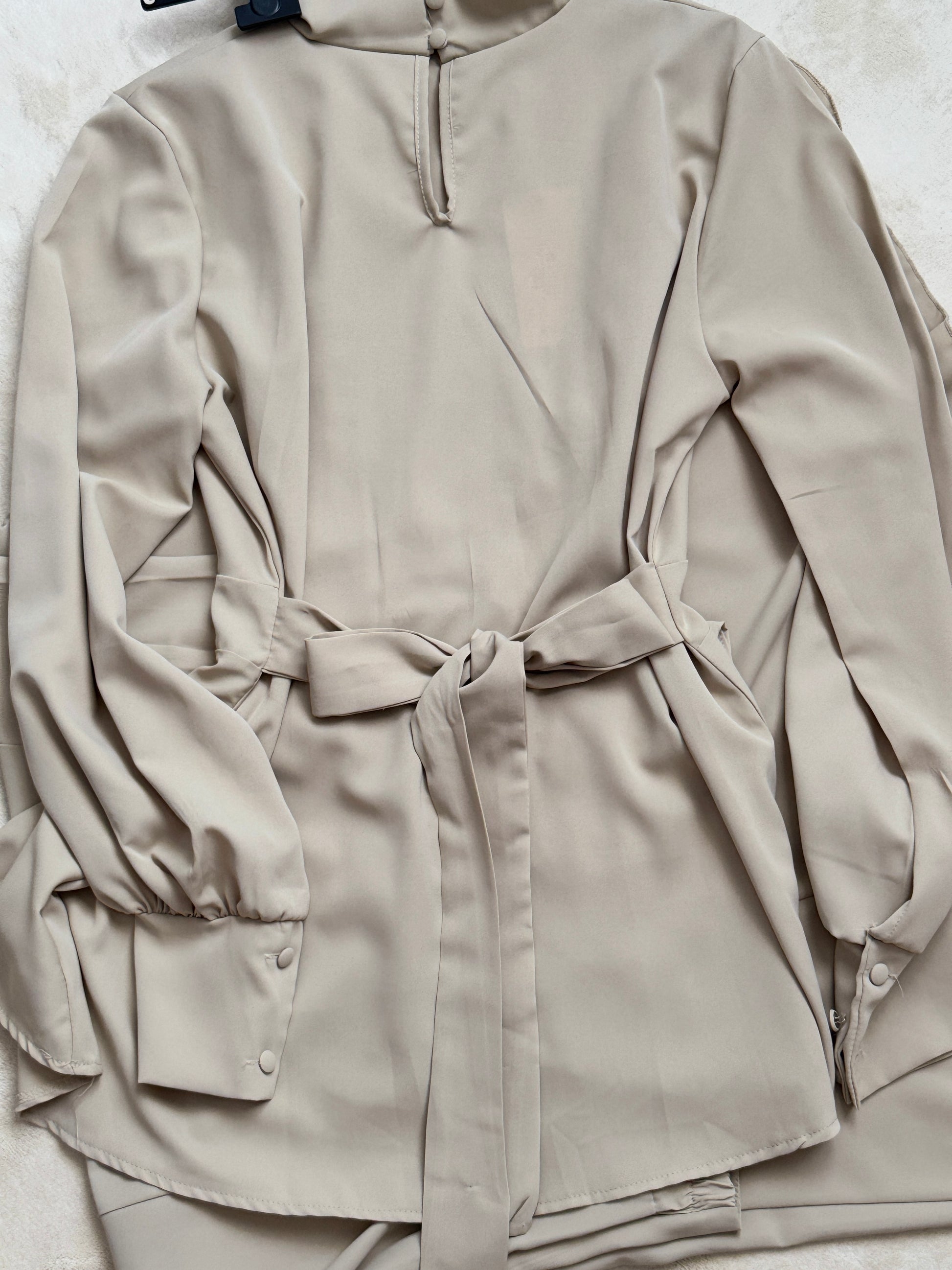 Le haut dispose de liens ajustables de chaque côté pour un ajustement précis, tandis que ses manches ballon sont dotées de poignets ajustés et boutonnés, alliant charme et confort maîtrisé.