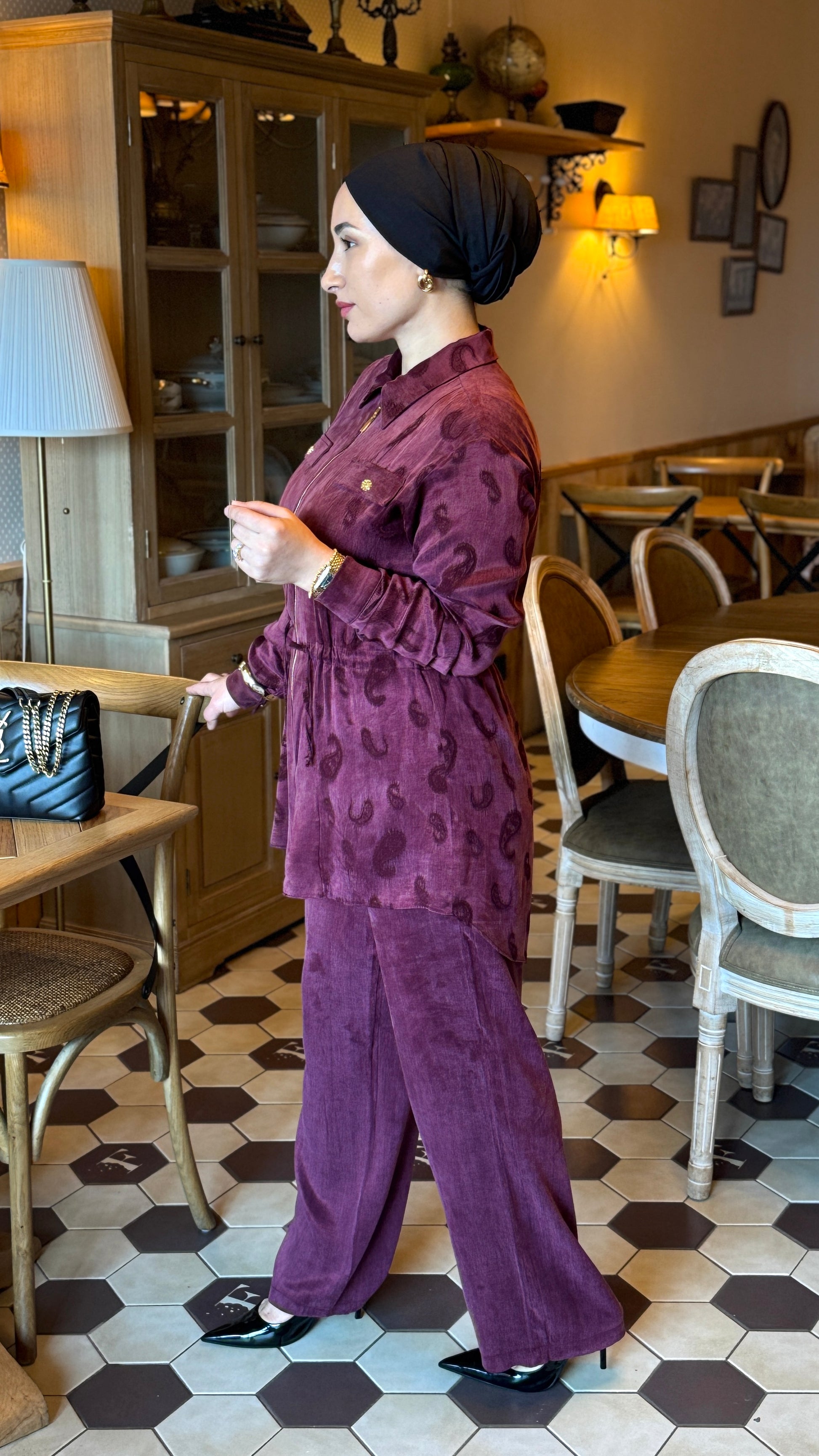 Plongez dans le luxe discret avec cet ensemble cupro soyeux en teinte bordeaux, une pièce maîtresse qui redéfinit l'élégance contemporaine.