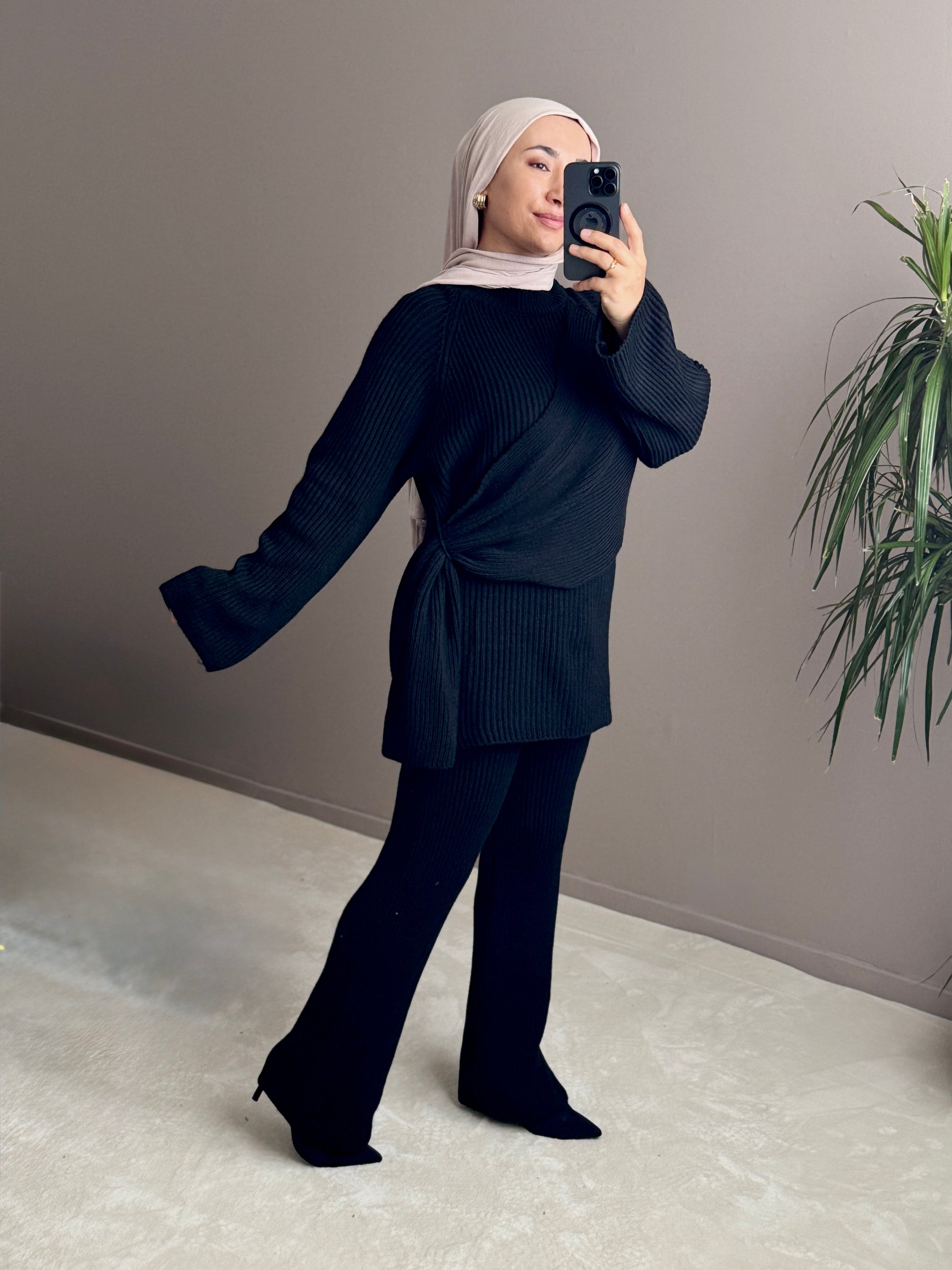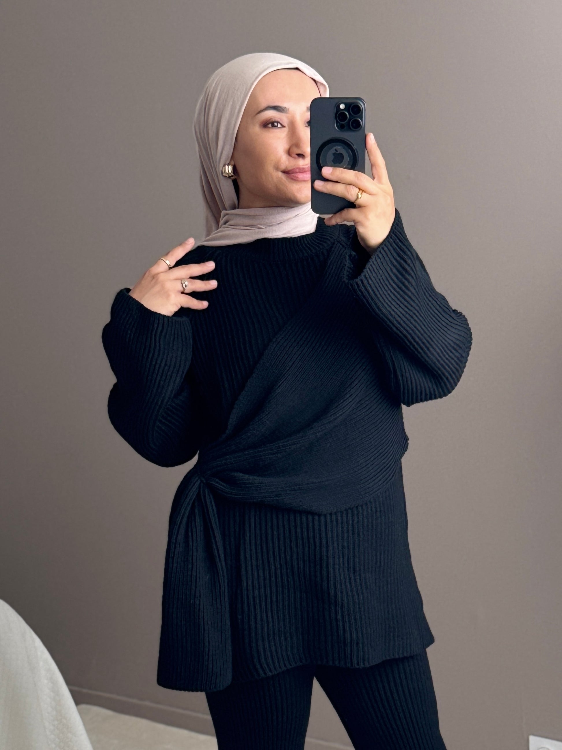 Cet ensemble en laine avec cape croisée sur le côté combine élégance et polyvalence.