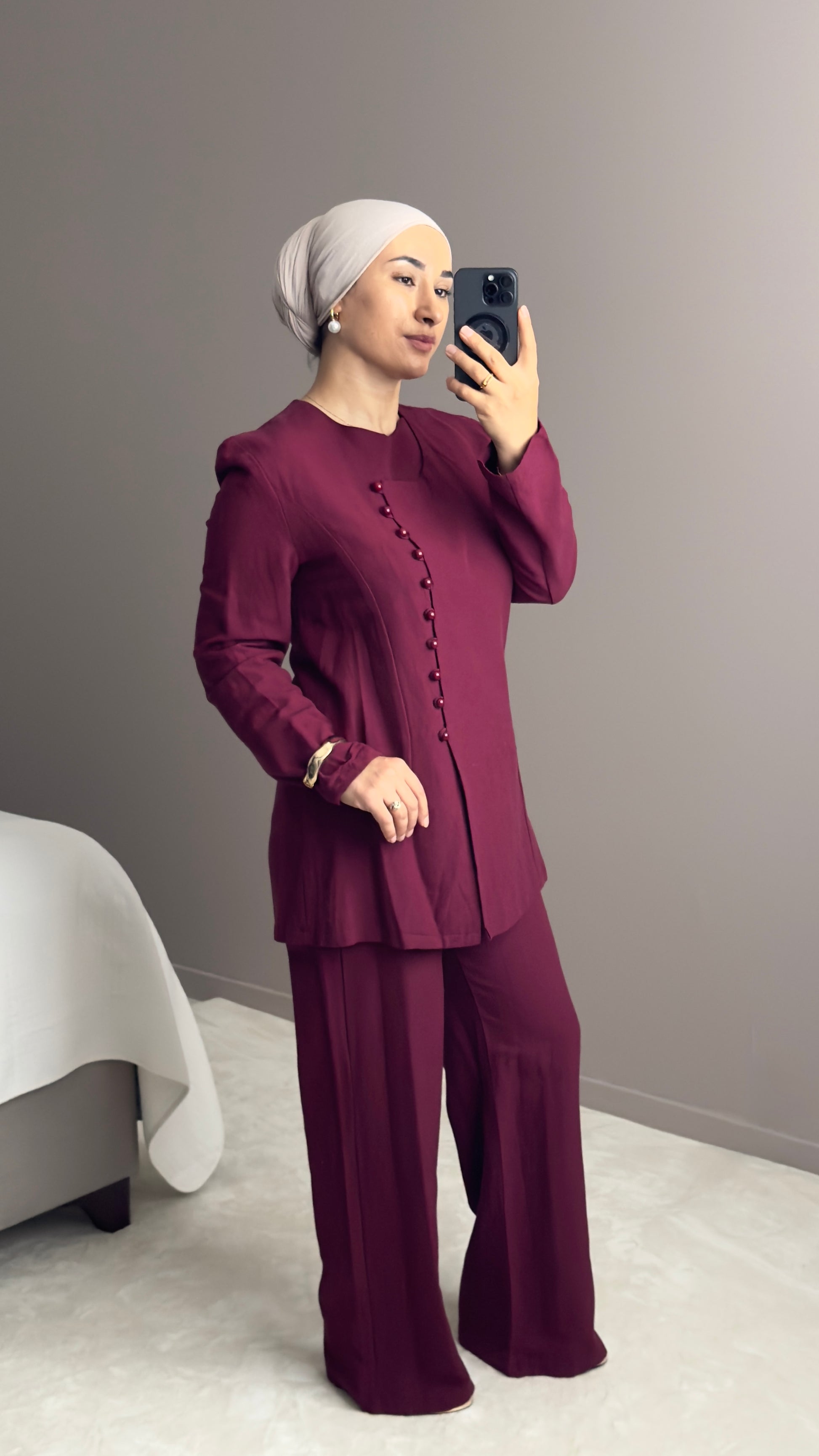 Ce superbe ensemble en lin bordeaux se compose d'une tunique à boutons latéraux et d'un pantalon en tissu lin.