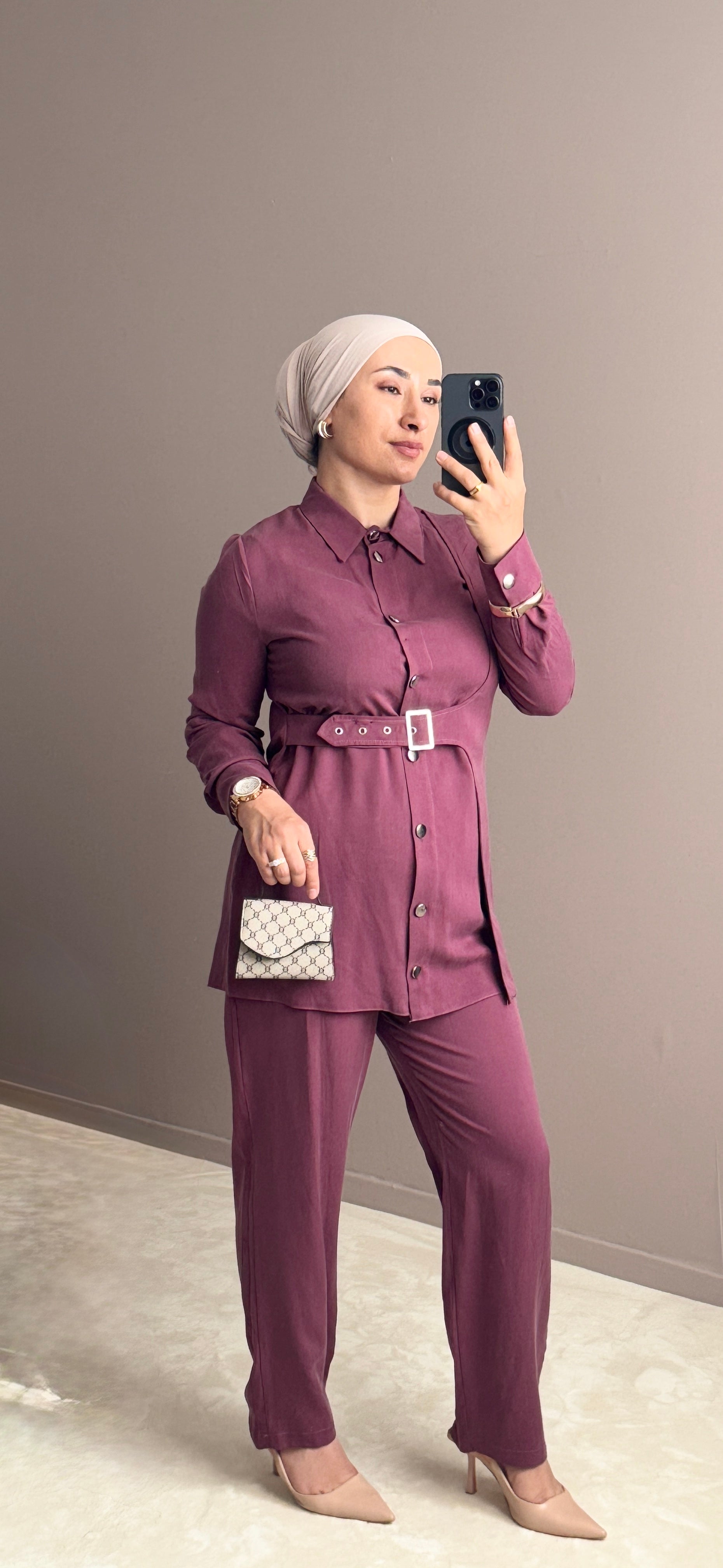 L'ensemble Lynda est confectionné dans un tissu modal exceptionnel, alliant confort et élégance. La pièce se distingue par une ceinture intégrée sous la poitrine qui structure délicatement la silhouette, tandis que le pantalon, doté d’une taille élastiquée, assure une aisance parfaite. Les boutons argentés apportent une finition raffinée, pour un look à la fois moderne et sophistiqué.