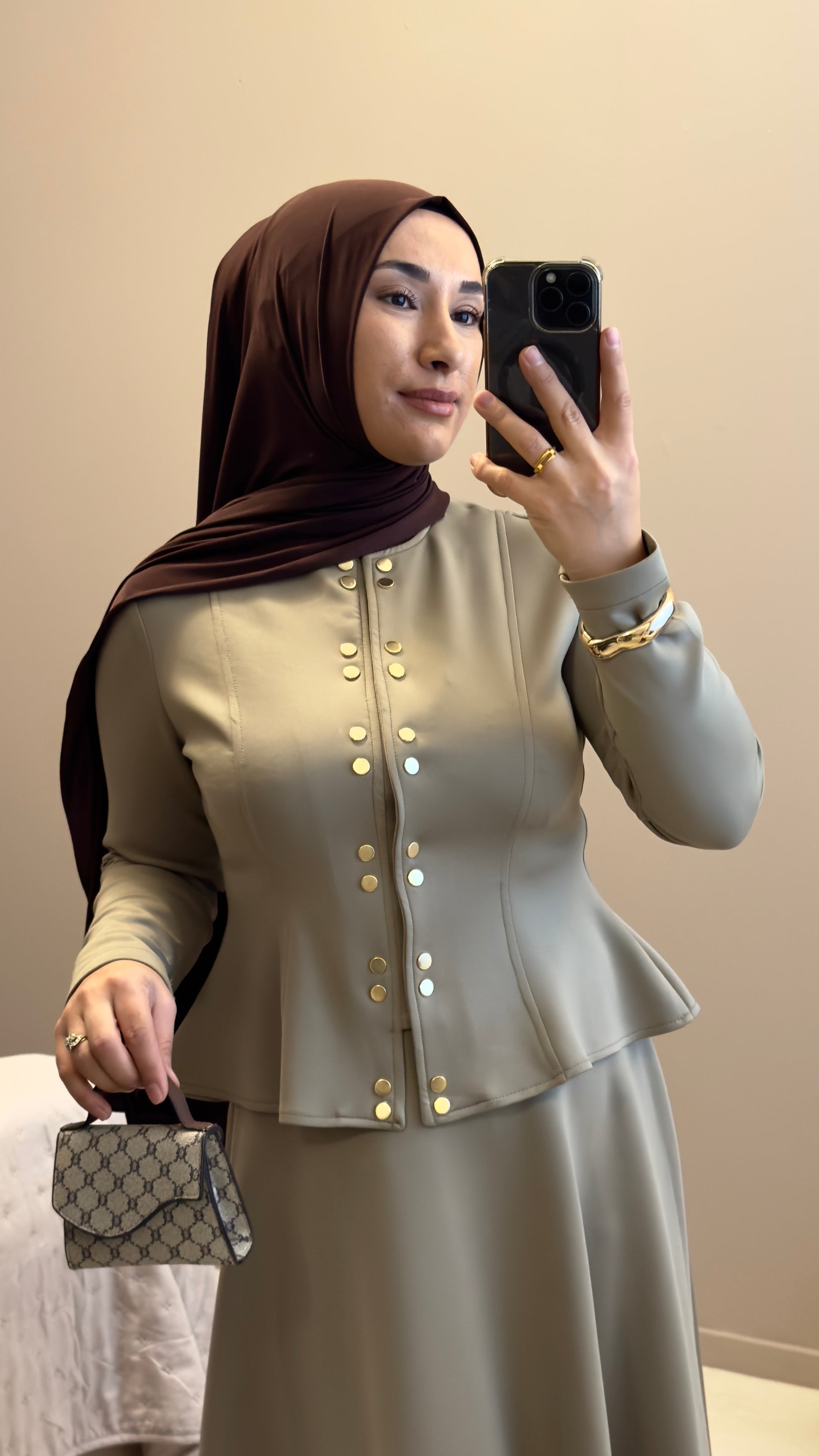 Le chemisier s'élargit gracieusement à partir de la taille, orné de détails dorés subtils qui capturent la lumière avec raffinement.