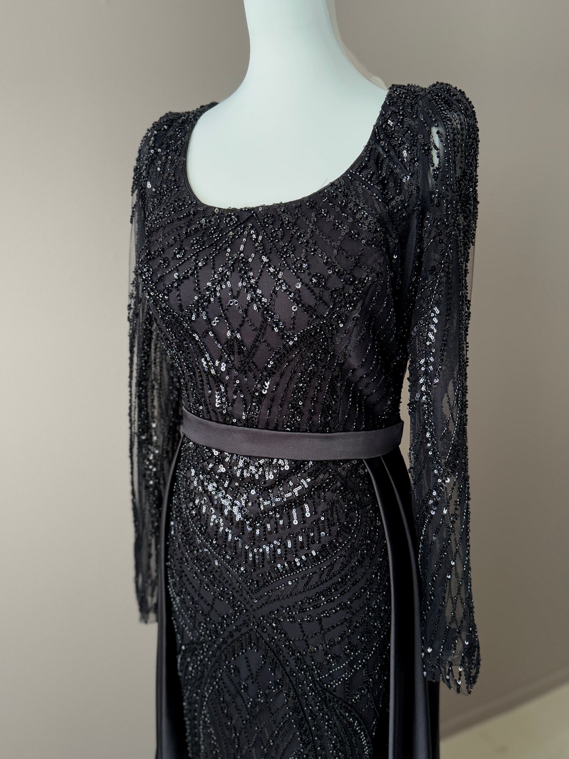 Robe de soirée longue noir pailletée avec traîne et ceinture