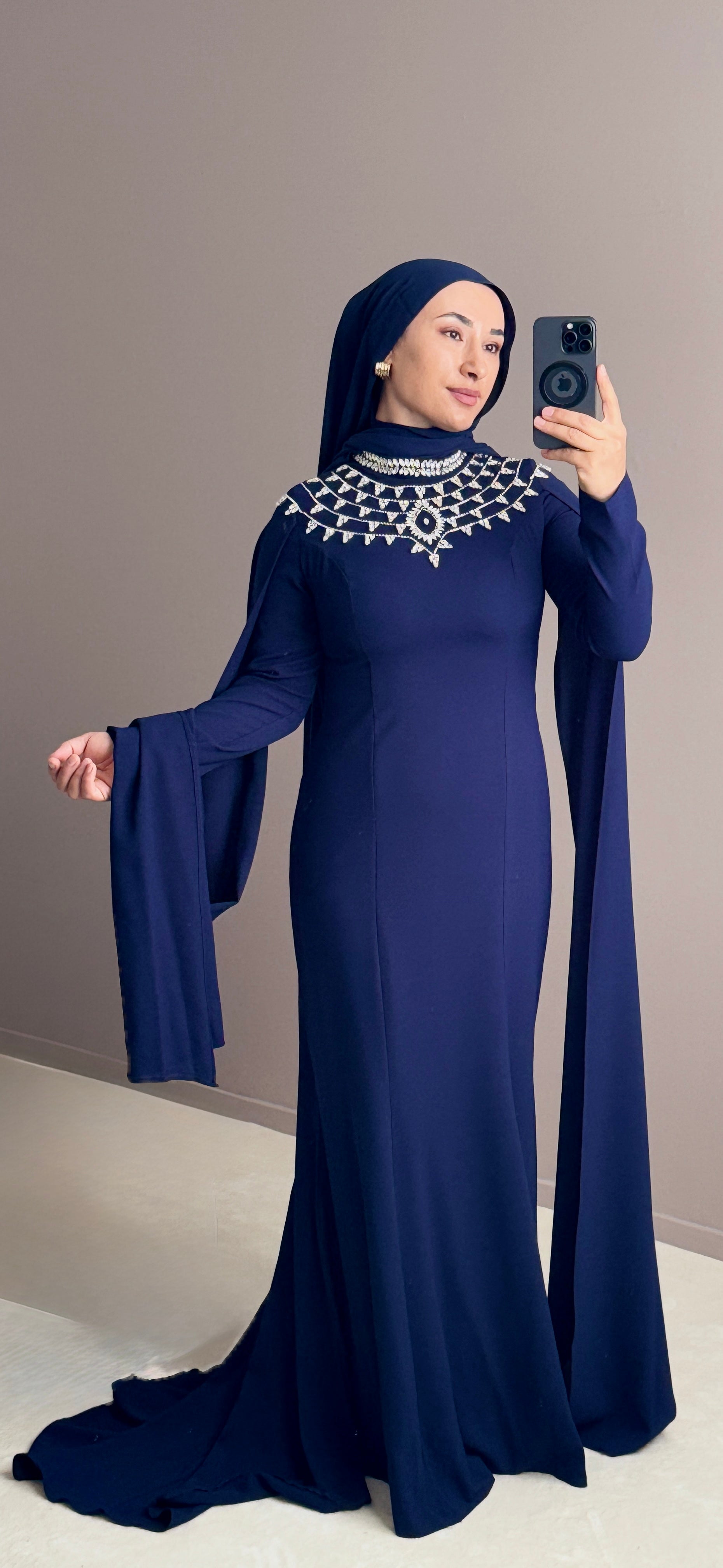 ROBE DE SOIREE SIRENE BLEU MARINE AVEC DES PELERINES AUX EPAULES