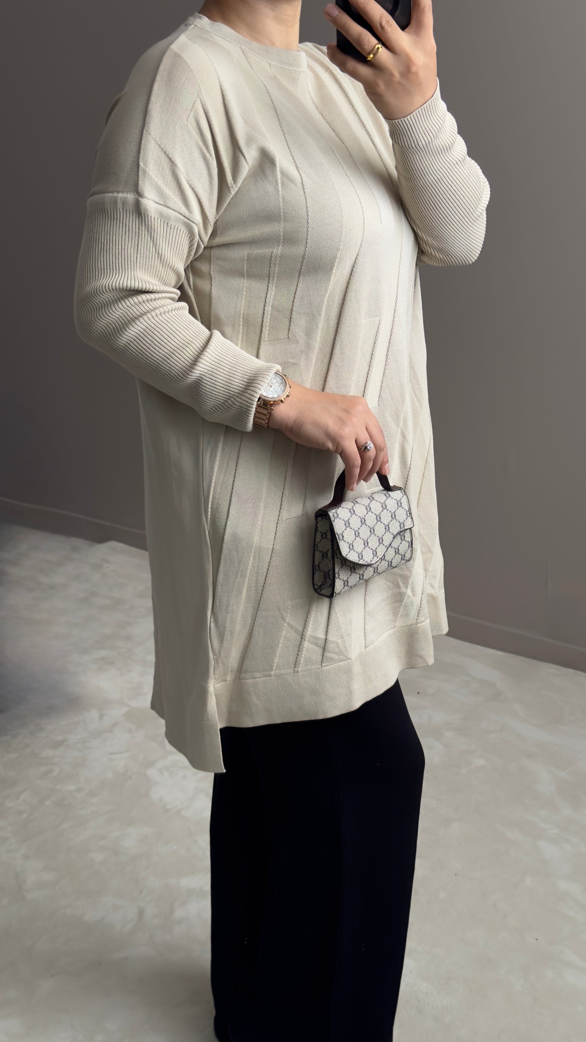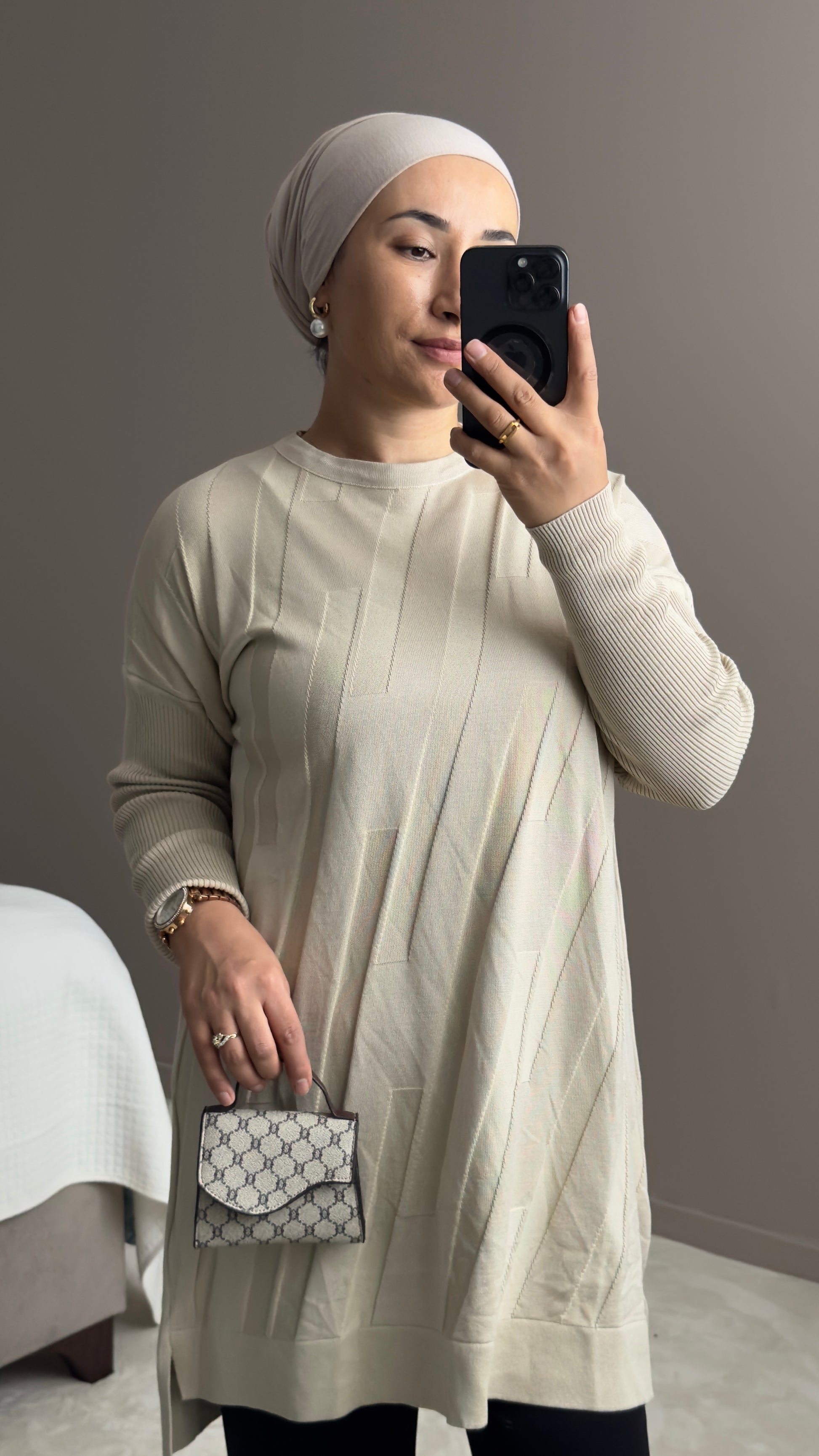 Cette tunique en tissu mercerisé à motifs intégrés allie élégance et confort. Sa coupe standard, avec des manches fines en maille côtelée, offre une silhouette raffinée et agréable à porter.