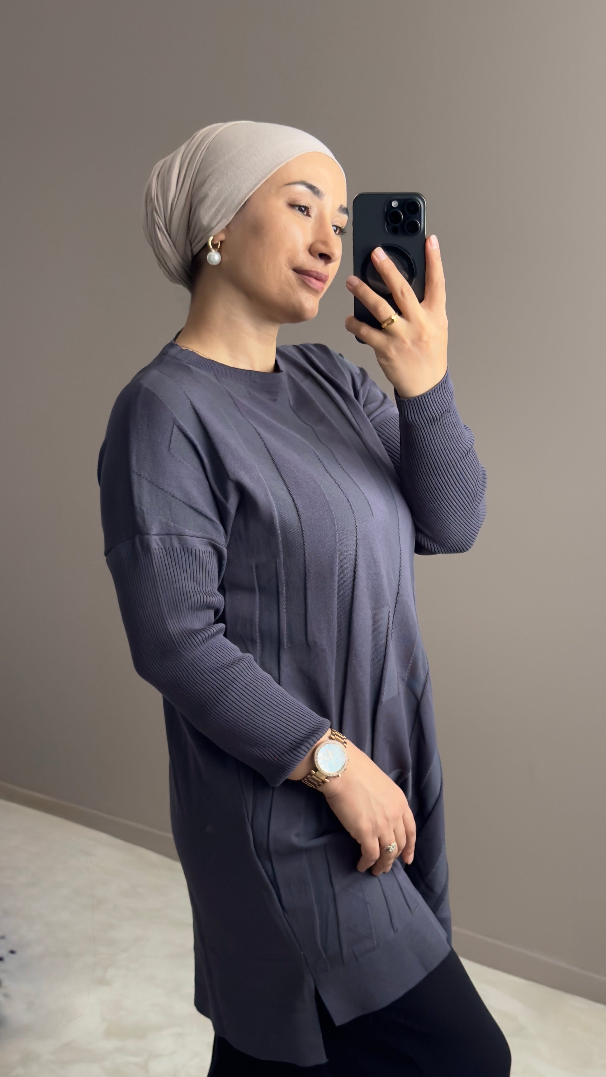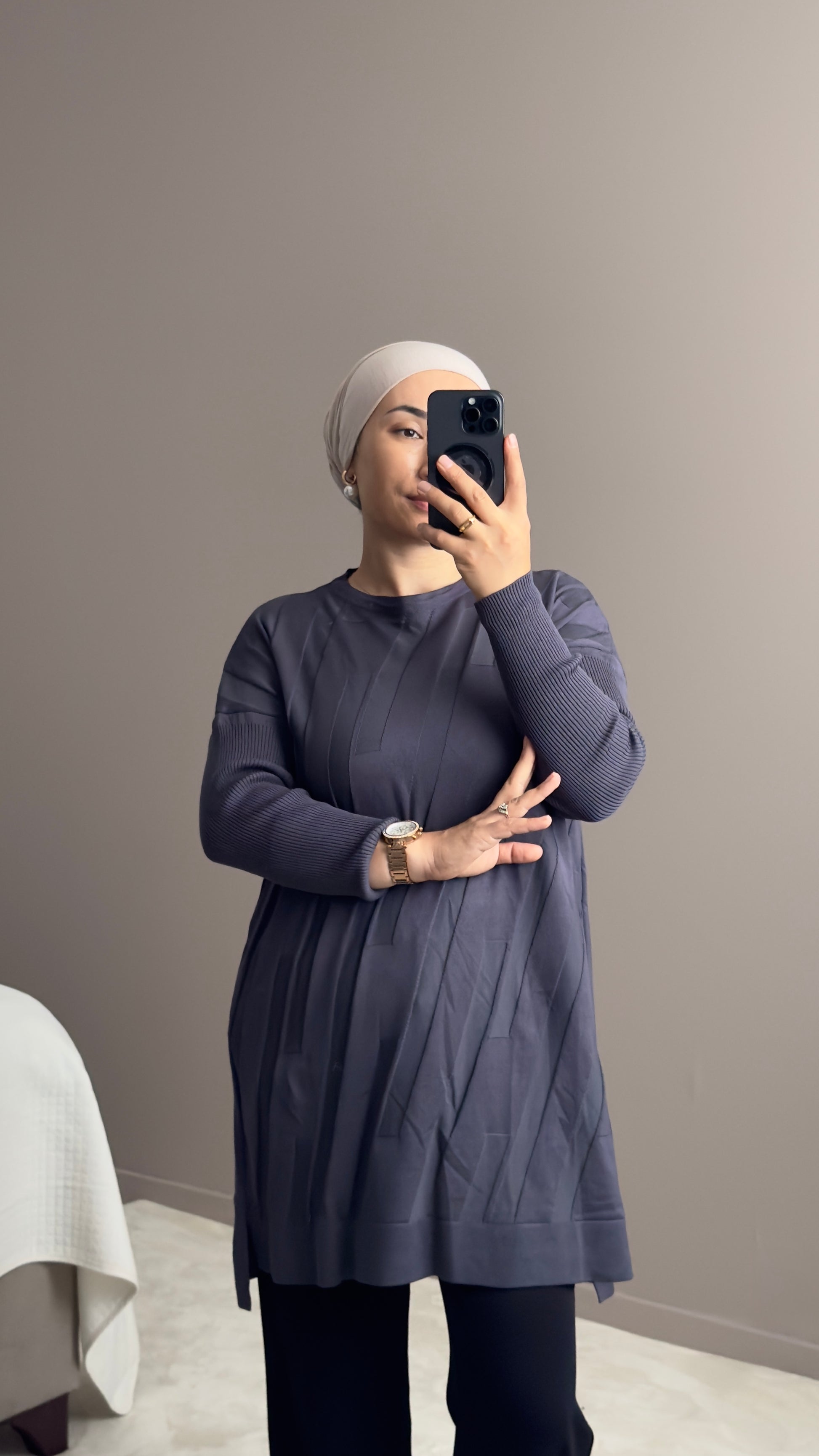 Cette tunique en tissu mercerisé à motifs intégrés allie élégance et confort. Sa coupe standard, avec des manches fines en maille côtelée, offre une silhouette raffinée et agréable à porter.